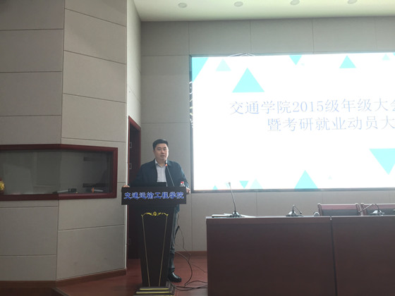 4月12日晚,交通学院在工二交通科技报告厅召开2015级年级大会暨考研就业动员大会,院党委副书记田上出席。会议邀请到学院2017届毕业生杨灿做考研分享,由15级辅导员彭笠主持,2015级全体学生参加。