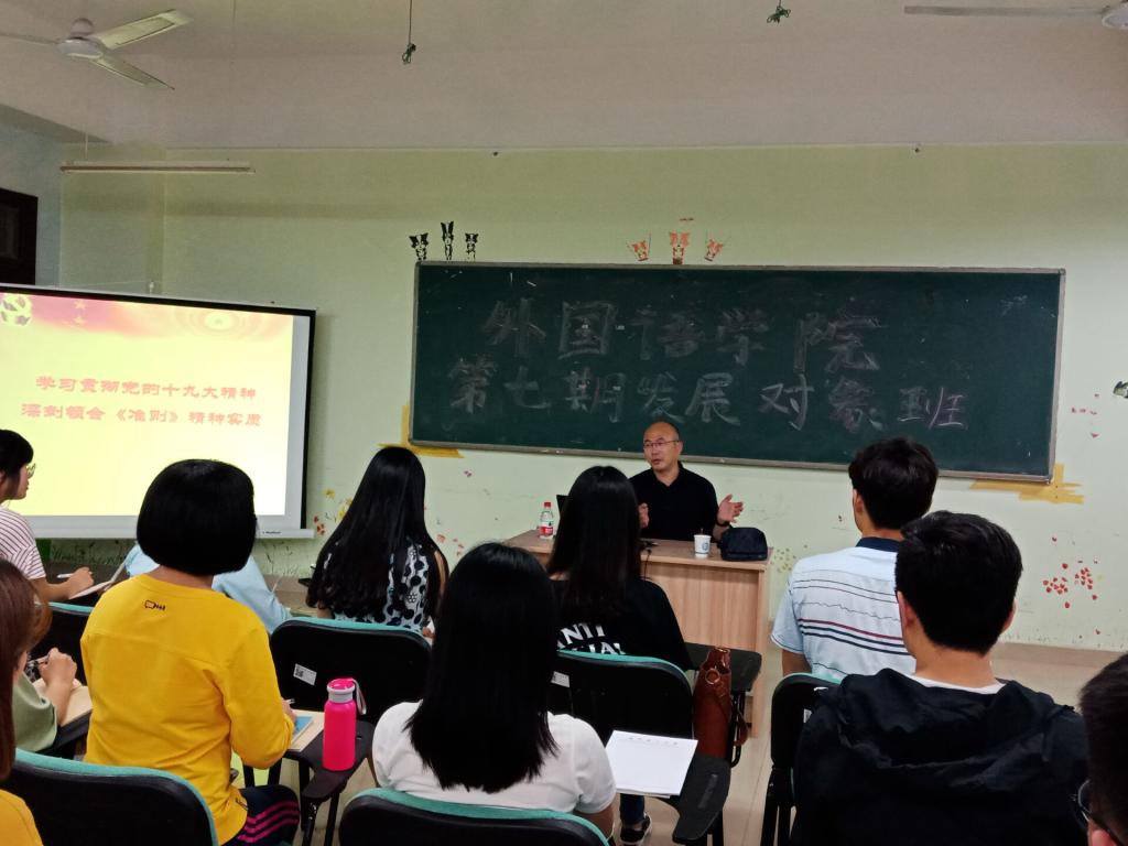 5月9日晚,外语学院在文科楼A503教室举行第七期发展对象党课培训班的第一次授课。本次课程主题为“党内政治生活的若干规定”,由学院分党委书记甘为主讲。