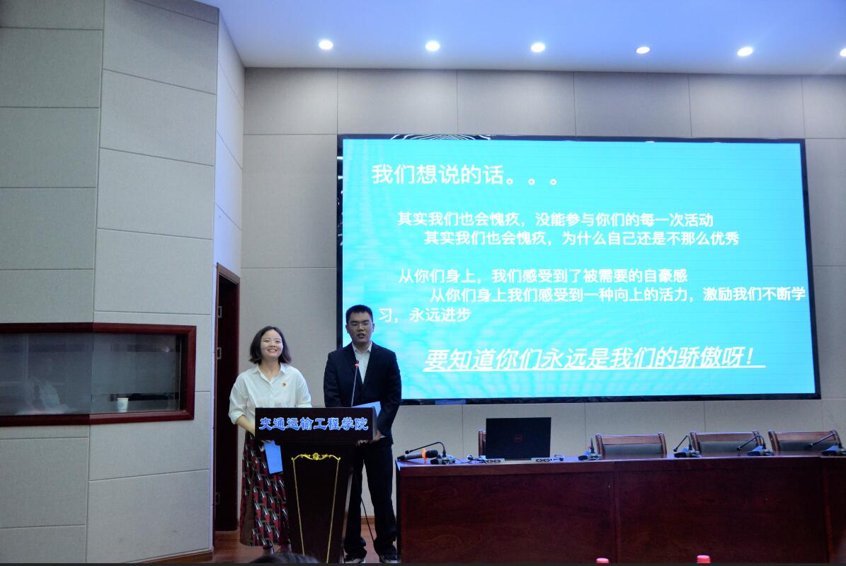 61日晚,交通学院十佳下班党员(干部)评选活动暨授徽受聘仪式在工二科技报告厅举行。校党委组织部副部长彭霞、院党委副书记田上、院关工委吴滨、党建辅导员肖敏强以及学工办全体老师莅临现场。