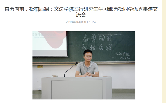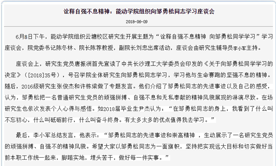 在研究生院的号召下,各学院研究生都认真开展了学习邹勇松优秀事迹活动。计通学院、电气学院、交通学院、文法学院、化学学院、能动学院.....学习邹勇松先进事迹的活动形式多样,深入人心。党员代表、文法学院研究生谢龙同学表示:要把邹勇松同学的事迹看成他人生前行和努力工作的助推器,不断奋斗,努力展现新时代的青年担当。