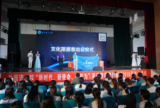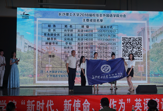 随后举行了文化摆渡者出征仪式。蒋昌波为两位即将前往利比里亚大学孔子学院担任汉语教师志愿者进行授旗。两位志愿者带领全体学生进行了文化摆渡宣誓。段胜峰作毕业致辞。他提出对18届毕业生的几点期望:要坚定文化自信,做自觉的文化摆渡人,将文化自信和奋斗精神作为自己的武器。文化传播不仅仅应是摆渡者的身份自觉,同时也是整个国家的期望。最后他嘱托:“外国语学院永远是大家温暖的家庭,毕业了,别忘了常回家看看!”紧接着,外国语学院2018届校友分会成立,甘为为4位18届校友会分会骨干进行授旗。