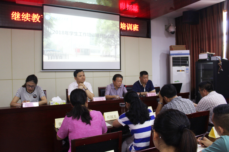 6月19日上午,继教学院组织全体学工干部和班主任在14教200举办为期一周的学生工作培训。院长颜鲜明出席了开班仪式并讲话。院党委书记何纯芳、党委副书记兼副院长方碧波、副院长向英、学院助学中心主任廖瑞虎、学工部主任任国芳、院团委书记刘卓明参加本次活动。