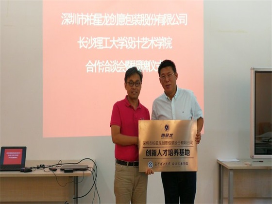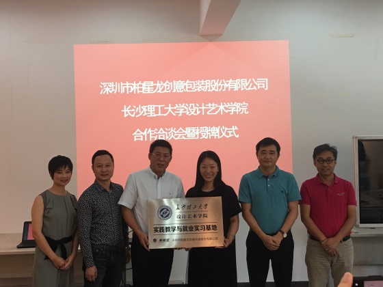 6月27日上午,设计艺术学院和深圳市柏星龙创意包装股份有限公司于建筑艺术楼A320举办合作洽谈会暨授牌仪式。该公司总经理赵祥等一行3人莅临学院进行校企合作事宜洽谈。院长王健、党委副书记陶双、副院长刘卫东及部分系主任和专业老师出席会议。