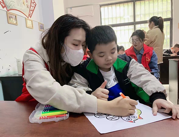 作品完成后每位小朋友脸上都洋溢着可爱的笑容,“志愿者小老师”也对他们的作品进行肯定和奖励。