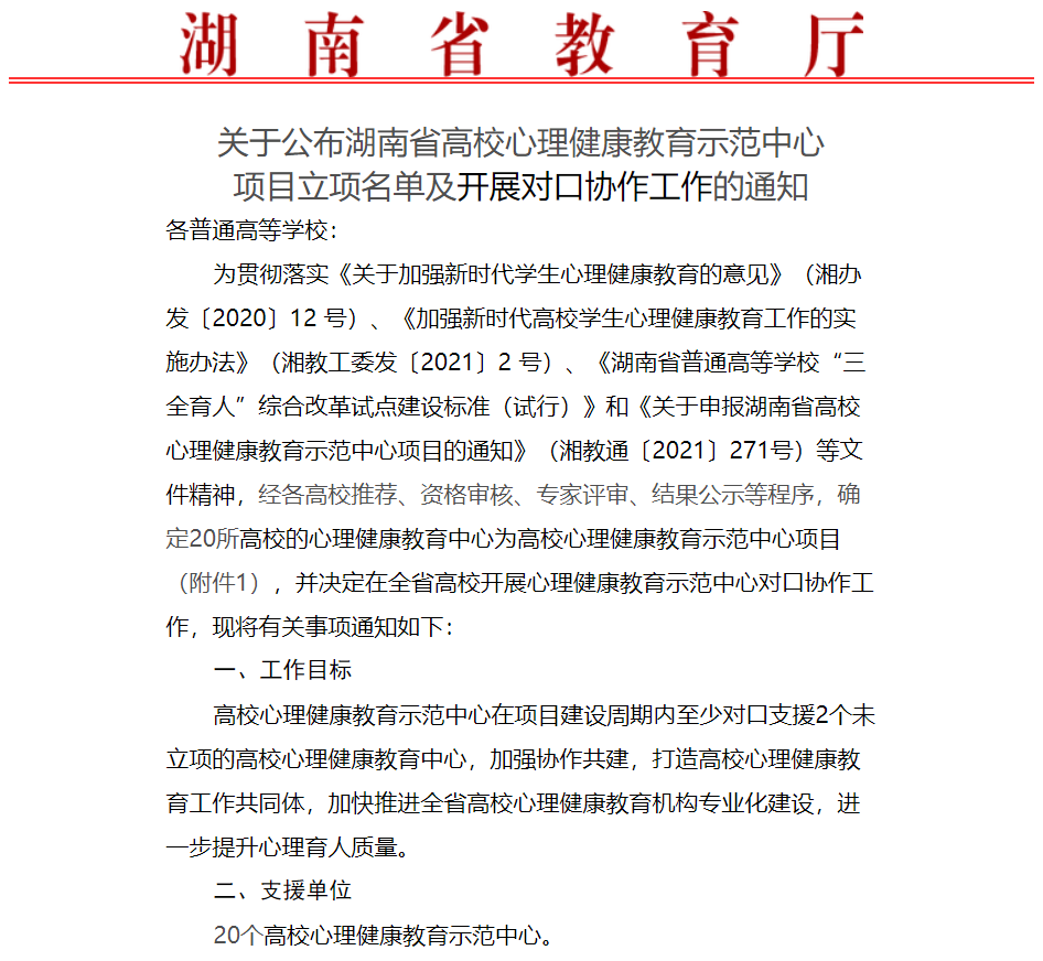 为加快推进全省高校心理健康教育机构专业化建设,进一步提升心理育人质量,湖南省教育厅开展了高校心理健康教育示范中心项目,并决定在全省高校开展心理健康教育示范中心对口协作工作。经各高校推荐、资格审核、专家评审、结果公示等程序,taptap点点心理健康教育中心于2021年12月成功立项湖南省高校心理健康教育示范中心。