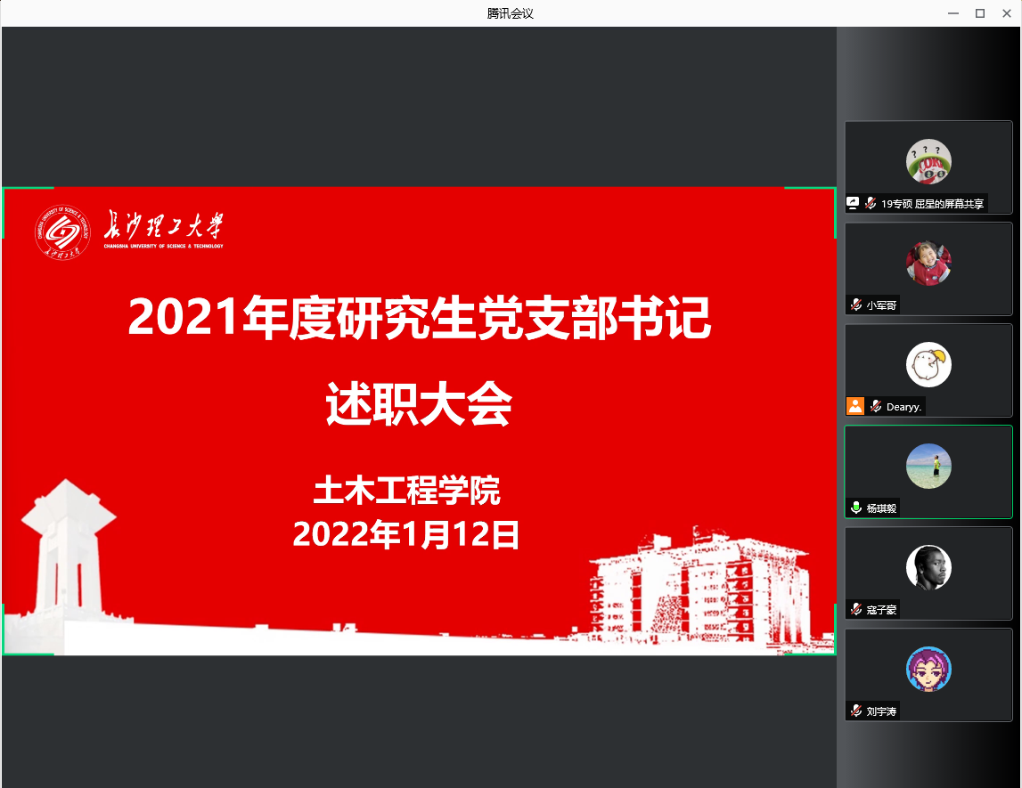 1月12日晚,土木工程学院在腾讯会议线上召开2021年度研究生党支部书记述职大会。院学生党总支副书记李小军和各研究生支部书记参加会议,2020级研究生第二党支部书记杨莹主持会议。
