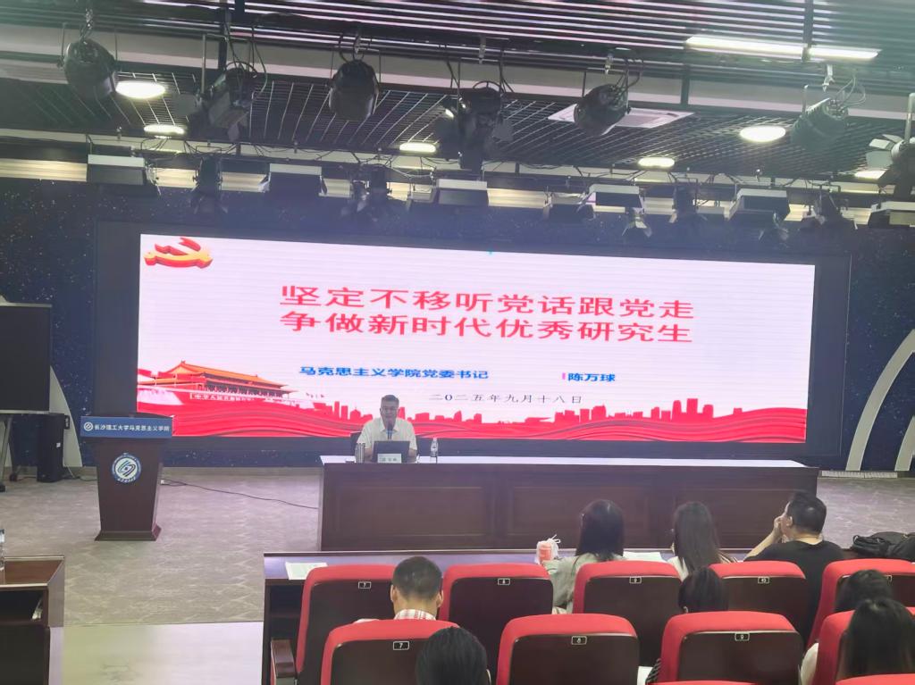 9月18日上午,马克思主义学院在云塘校区文科楼B300报告厅举行“书记第一堂党课”,本次活动由学院学生工作办公室主任、辅导员曾蓓主持,院党委书记陈万球主讲,2025级全体研究生参加。