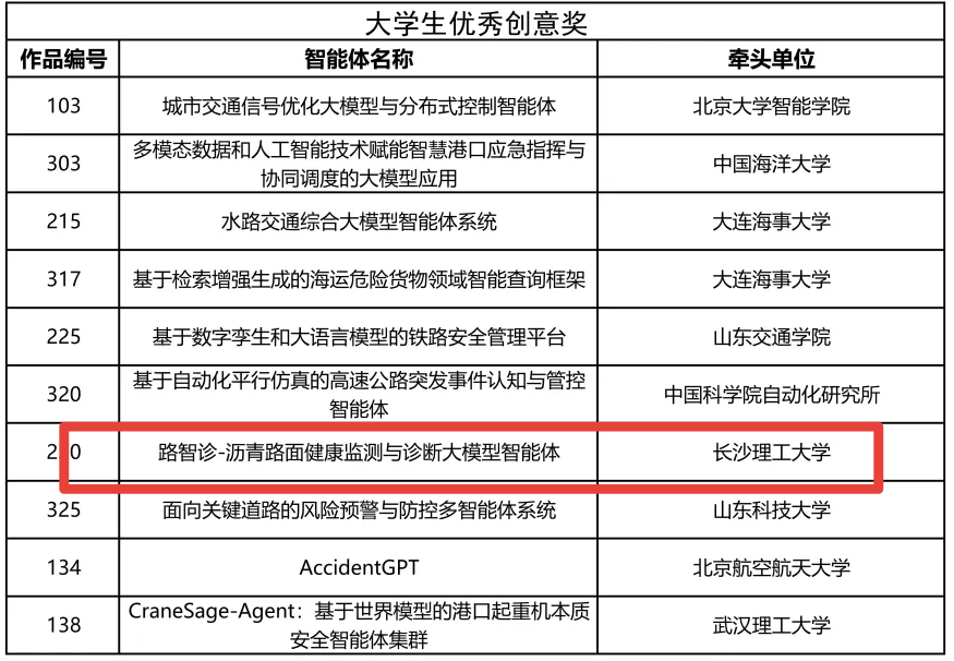 12月9日至10日,由交通运输部科技司等单位指导的领域权威赛事“第一届综合交通运输大模型智能体创新应用大赛全国总决赛”在厦门举行,经过激烈角逐,由taptap点点交通学院吕松涛教授团队报送的作品《路智诊-沥青路面健康监测与诊断大模型智能体》最终荣获“大学生最佳创意奖”。