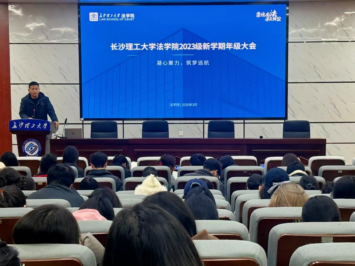 为切实保障学生安全,引导大三学生做好新学期规划,近日,法学院在金盆岭校区四教学术报告厅举行2023级本科生年级大会。本次会议由年级辅导员兰贵辉主持,2023级全体学生参会。