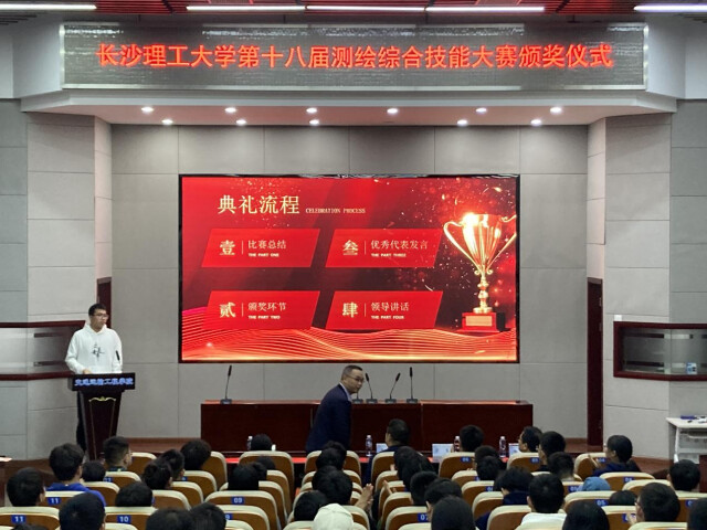 11月2日,学校第十八届测绘技能大赛举行颁奖典礼。经过评委老师的评定,大赛共评出一等奖7组、二等奖10组、三等奖14组、优胜奖12组。交通运输工程学院副院长叶群山、长沙鑫瑞测量科技有限公司销售经理李晓明、测绘系支部书记徐鹏、测绘系主任张云菲等老师出席颁奖典礼。