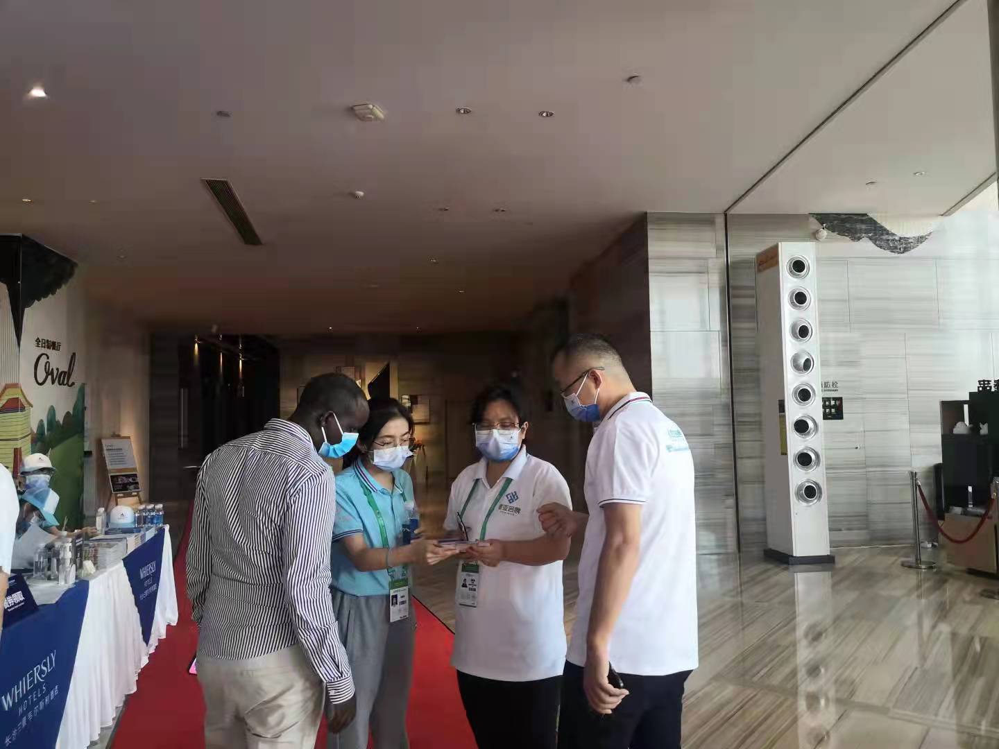 在如此高温环境下,即使汗水湿透了口罩与衣服,志愿者们坚持穿戴好口罩,在防疫的大条件下配合工作,克服了许多困难。外国语学院志愿者们与会展的工作人员紧密配合,同参展嘉宾耐心交流,充分展现了外国语学院学子积极开朗、大方得体的形象。