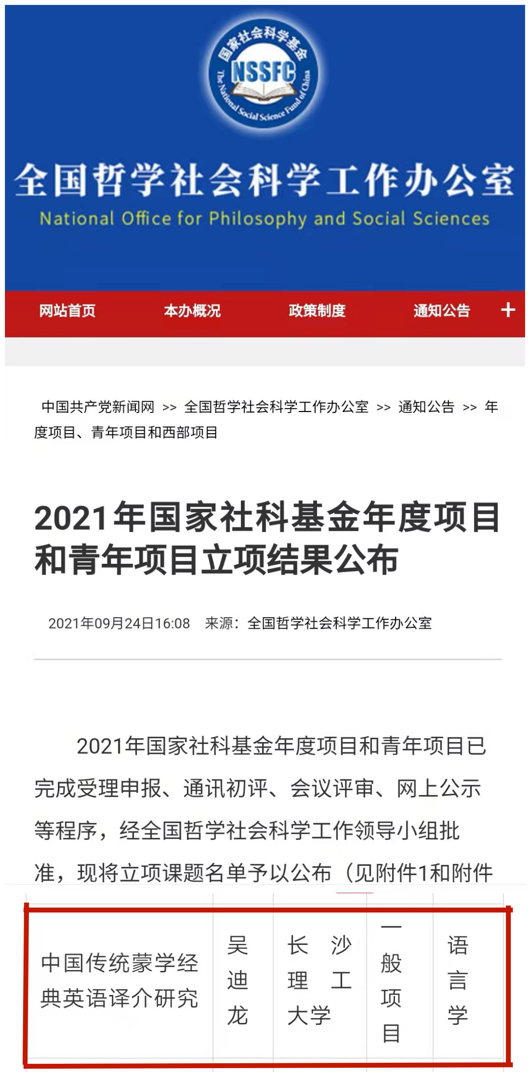 9月24日,全国哲学社会科学办公室正式公布了2021年国家社科基金年度项目和青年项目立项名单,我院院长吴迪龙教授申报的《中国传统蒙学经典英语译介研究》课题获批立项。
