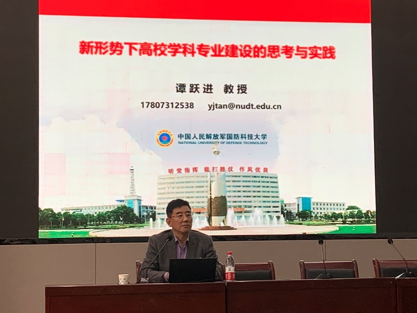 谭跃进提出关于如何加强学科专业建设的十大举措:一是要把握高等教育的新形势;二是要厘清学科专业建设内涵;三是要有系统思维和大数据思维;四是要加强新队伍和团队建设;五是要打牢理工结合的数理基础;六是要制定好人才培养方案;七是要抓好人才培养质量;八是要建设一流的实验环境;九是要有组织科研、出标志性成果;十是要有长效的激励机制和措施。最后强调,学科建设是龙头,专业建设是依托,课程建设是基础,学科建设与专业建设通过课程建设起作用。