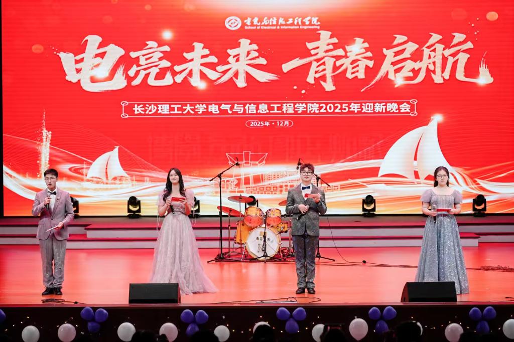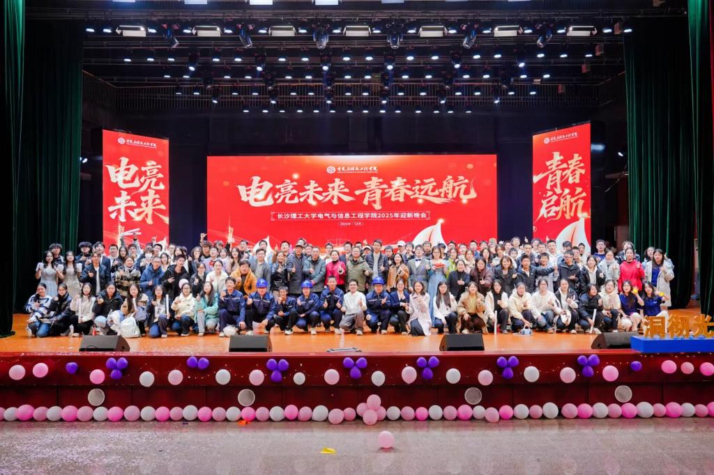 1225日晚,“电亮未来,青春启航”电气与信息工程学院2025年迎新晚会在云塘校区大礼堂举行。校党委委员、副校长张军辉出席并讲话,湖南科比特集团董事长郭贵雄、总裁刘庆文、副总裁彭宇,北京双杰电气有限公司副总裁许专、副总经理曾艳等校友代表,学校教育基金会秘书长肖辉,学院党委书记丁丹等在家院领导,电网防灾减灾全国重点实验室顾问符慧林,2025级新生班主任代表及20251089名新生参加。