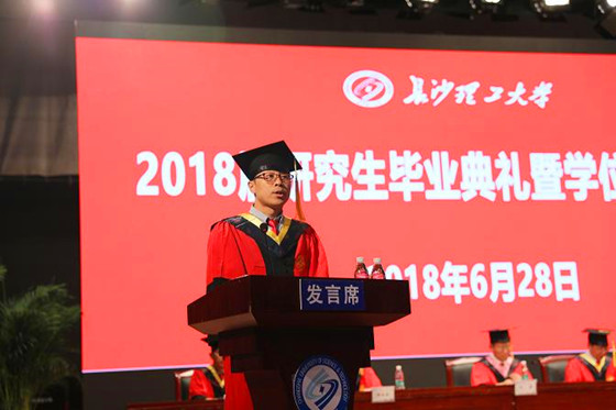 “期盼你们高飞,期盼我们再见。”青年长江学者、全国百优博士论文获得者、土木工程学院博士生导师王磊教授代表全体研究生导师,向毕业的研究生们表示了祝贺。他与同学们分享了他二十年来的经历,并表达了对毕业生的期待。他希望每个毕业生都能慎独守正,做一个敢担当的人;能博学善思,做一个肯钻研的人;能心存感激,做一个有大爱的人。