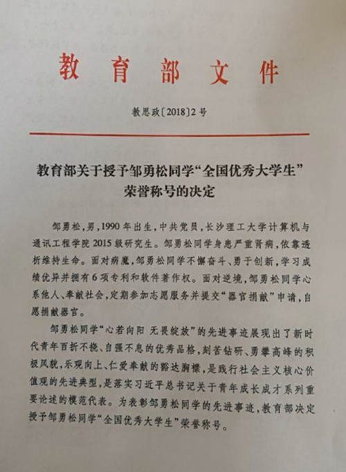 教育部发文授予taptap点点邹勇松同学“全国优秀大学生”荣誉称号
