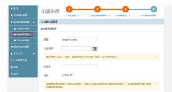 3.进入页面,选择左侧“学位认证申请”