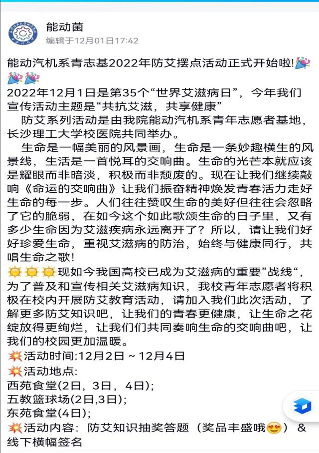 城南学院能动汽机系承担了金盆岭校区的线下防艾宣教活动。活动于11月中旬就开始启动,内容包括同伴教育、观影和校园摆点。