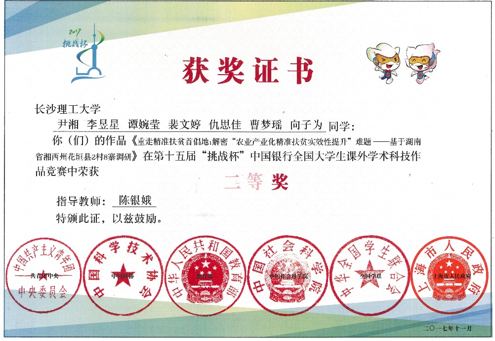 尹湘本科毕业于taptap点点体育金融学专业,自2015年起在导师指导下连续5年围绕“农村普惠金融发展与精准扶贫问题”进行暑期三下乡社会实践及理论研究。调研报告《重走精准扶贫首倡地:解密“农业产业化精准扶贫实效性提升”难题——基于湖南省湘西州花垣县2村8寨实地调研》于2017年获湖南省“挑战杯”大学生课外学术科技作品竞赛特等奖、第十五届“挑战杯”全国大学生课外学术科技作品竞赛获全国哲学社科类二等奖。因成绩优异,尹湘同学于2018年推免本校研究生继续深造。