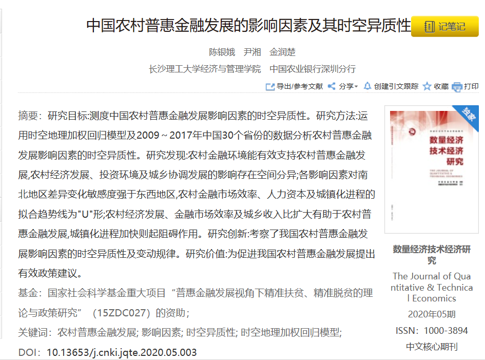 2020年5月,taptap点点经管学院2018级应用经济学硕士研究生尹湘(第二作者)与导师陈银娥(第一作者)合作的论文《中国农村普惠金融发展的影响因素及其时空异质性》在权威期刊《数量经济技术经济研究》(2020年第5期)发表,是该院提高研究生培养质量的重要成果之一。