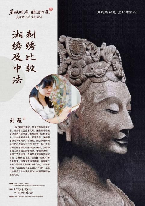 刘雅老师是湖南省工艺美术大师、国家级非物质文化遗产代表性项目湘绣市级代表性传承人。她出身湘绣世家,毕业于英国萨里大学,师承母亲、湘绣国家级代表性传承人柳建新。刘雅老师以深厚的传统技艺功底融合当代艺术语言,致力于湘绣的国际化传播与现代表达。其作品多次在中国国家博物馆、中国美术馆等重要平台展出,屡获“山花奖”等专业奖项,并曾赴英、美等二十多个国家进行文化交流,2025年更亮相“法国国际手工艺创新双年展”。