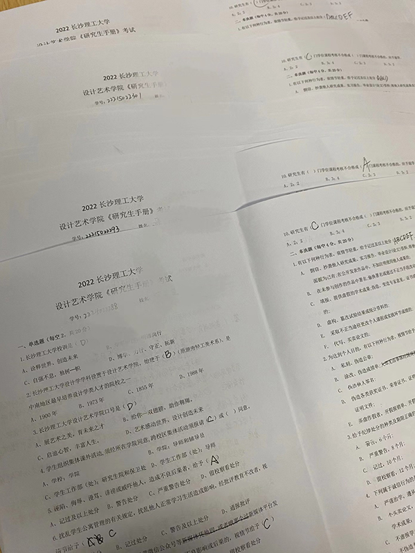 9月22日中午,设计学院组织全体2022级研究生进行了《研究生手册》考试,本次考试在建筑艺术楼A102进行。