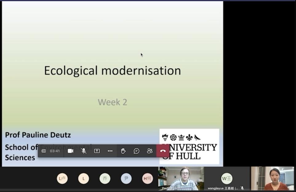 课程中,Pauline Deutz教授通过问答互动的方式从三个方面展开:1. 现代化与生态现代化的理论联系。2.生态现代化理论的起源与发展。3.来自不同国家的实践例子。为保证和增强同学们的学习效率,邓老师进行了全程中英翻译,促进了线上交流学习的质量。