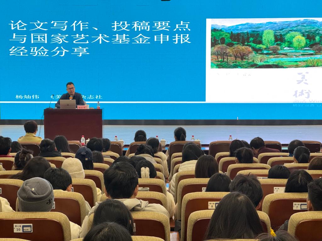 为进一步搭建高水平的学术平台,提升学院师生的科研能力与学术素养,2025年1月3日上午,在学院A101报告厅举办《论文写作、投稿要点与国家艺术基金项目申报经验分享》专题讲座。邀请的主讲嘉宾为中国艺术研究院艺术学博士、清华大学艺术学博士后、CSSCI期刊《美术》杂志社研究员、学术交流部主任杨灿伟,讲座由学院科研副院长蔡花菲主持,校社科处副处长(主持工作)刘坚、院党委书记郭剑、副书记万馨、副院长李娟娟及学院200余师生聆听讲座。